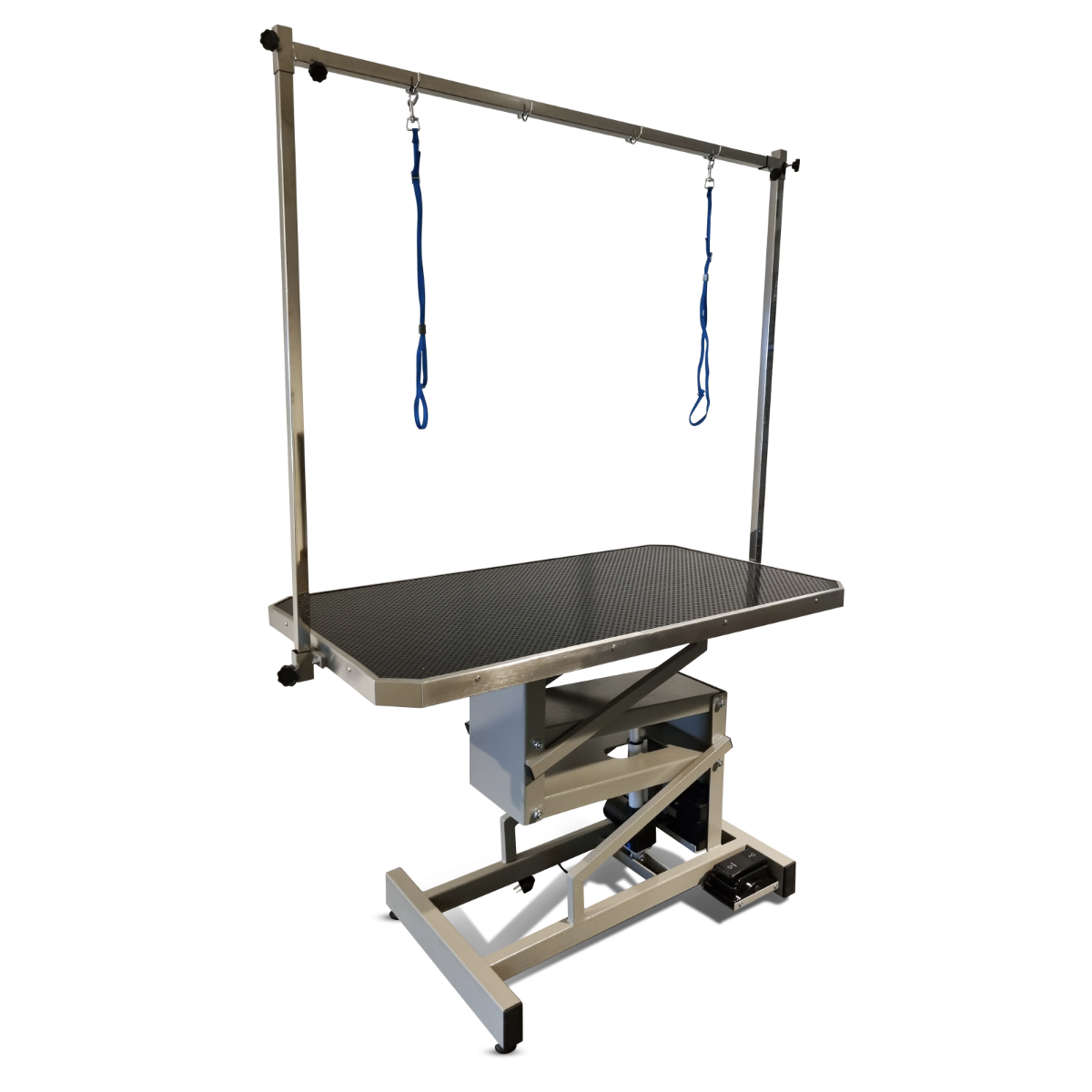 Entdecken Sie den elektrischen Trimmtisch Chicago, eine ideale Wahl für professionelle Hundefriseure, die ein hervorragendes Preis-Leistungs-Verhältnis suchen. Mit einer geräumigen Arbeitsfläche von 110 x 60 cm bietet dieser Tisch reichlich Platz für größere und schwerere Hunde. Eine Stabilitätsstange unter der Arbeitsplatte sorgt für zusätzliche Stabilität, und die Arbeitsplatte selbst ist mit einer Edelstahlleiste umrahmt, die für Langlebigkeit sorgt.