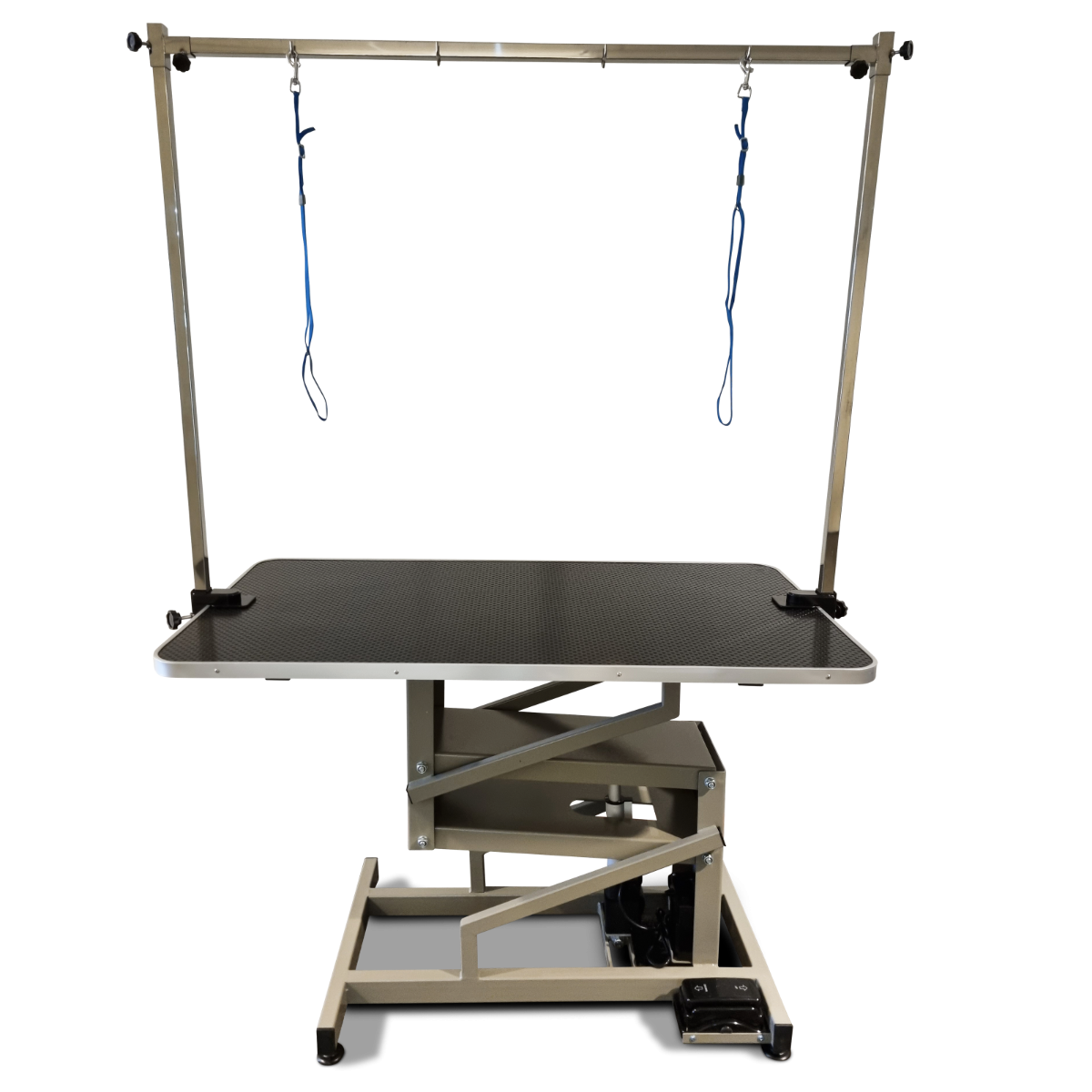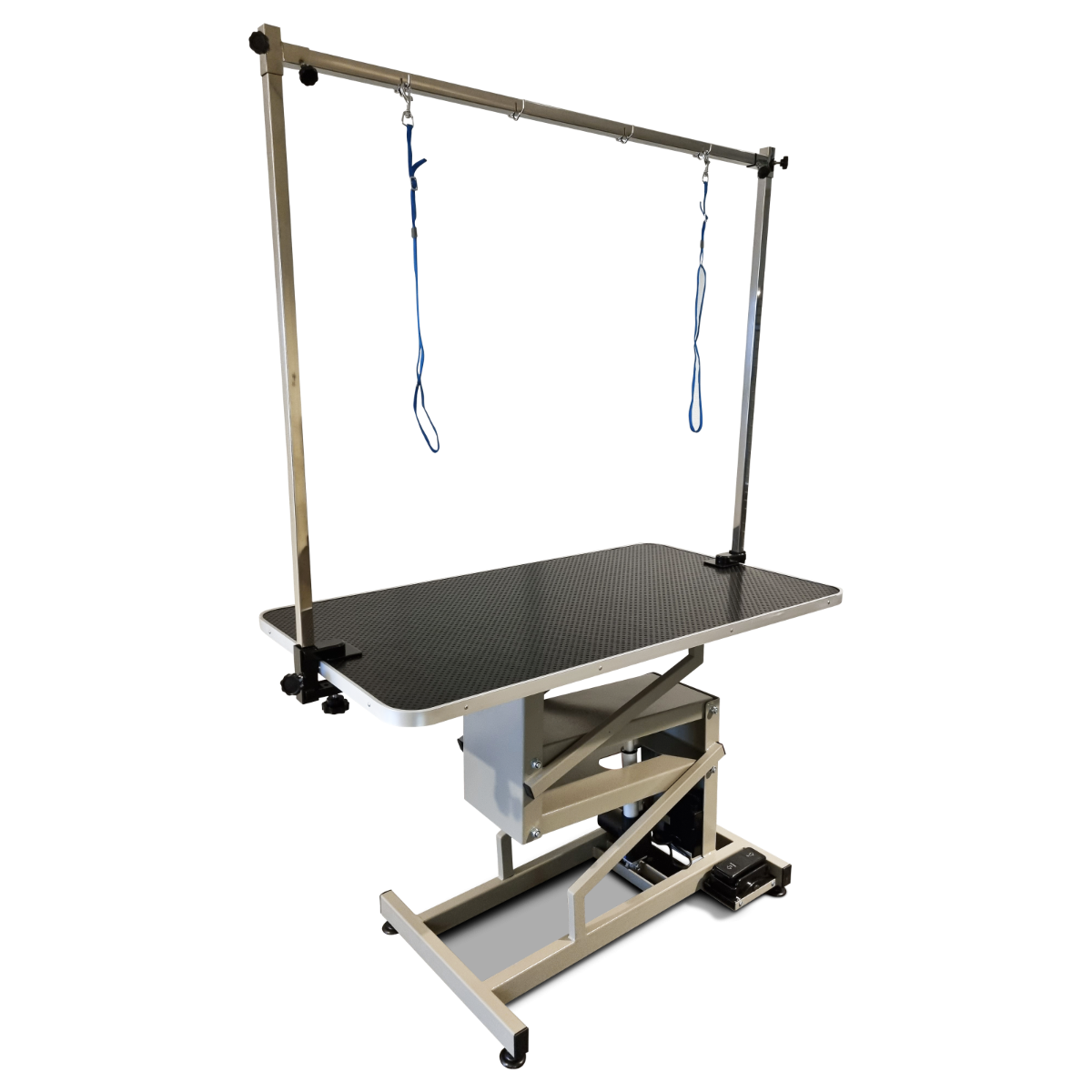 Die stufenlose elektrische Höhenverstellung von 50 cm bis 97 cm erleichtert Ihrem vierbeinigen Freund das Auf- und Absteigen und beugt Rückenproblemen vor, da er nicht heben muss. Der robuste Metallsockel ist mit einer haltbaren Epoxidharz-Hartlackierung versehen, während die verstellbare doppelte Trimmstange über den gesamten Tisch verläuft, so dass Ihr Haustier an drei Punkten gesichert werden kann.